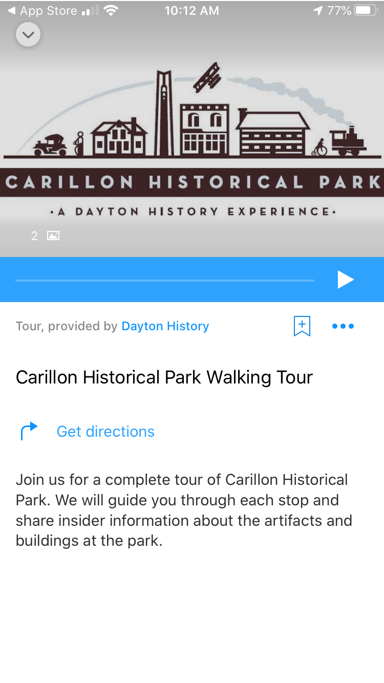 Using the free izi.Travel app we helped create multiple mobile audio tours for the Carillon Historical Park, a 65-acre park and museum in Dayton, Ohio. The park contains dozens of historic buildings and exhibits concerning the history of technology and the history of Dayton and its residents from 1796 to the present. The app can be accessed by visitors at the park on their personal mobile devices to help them navigate the spacious site. The tours are not location locked, so they can be accessed by anyone who wants to learn more about the park if they are unable to physically visit. We assisted with selecting sites, creating content, writing scripts, sourcing photos, and recording the audio.