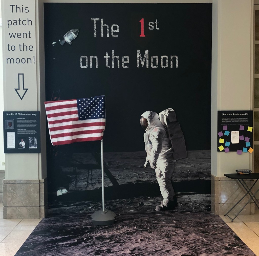 An interactive display featuring the only 1st Infantry Division patch to orbit the moon.